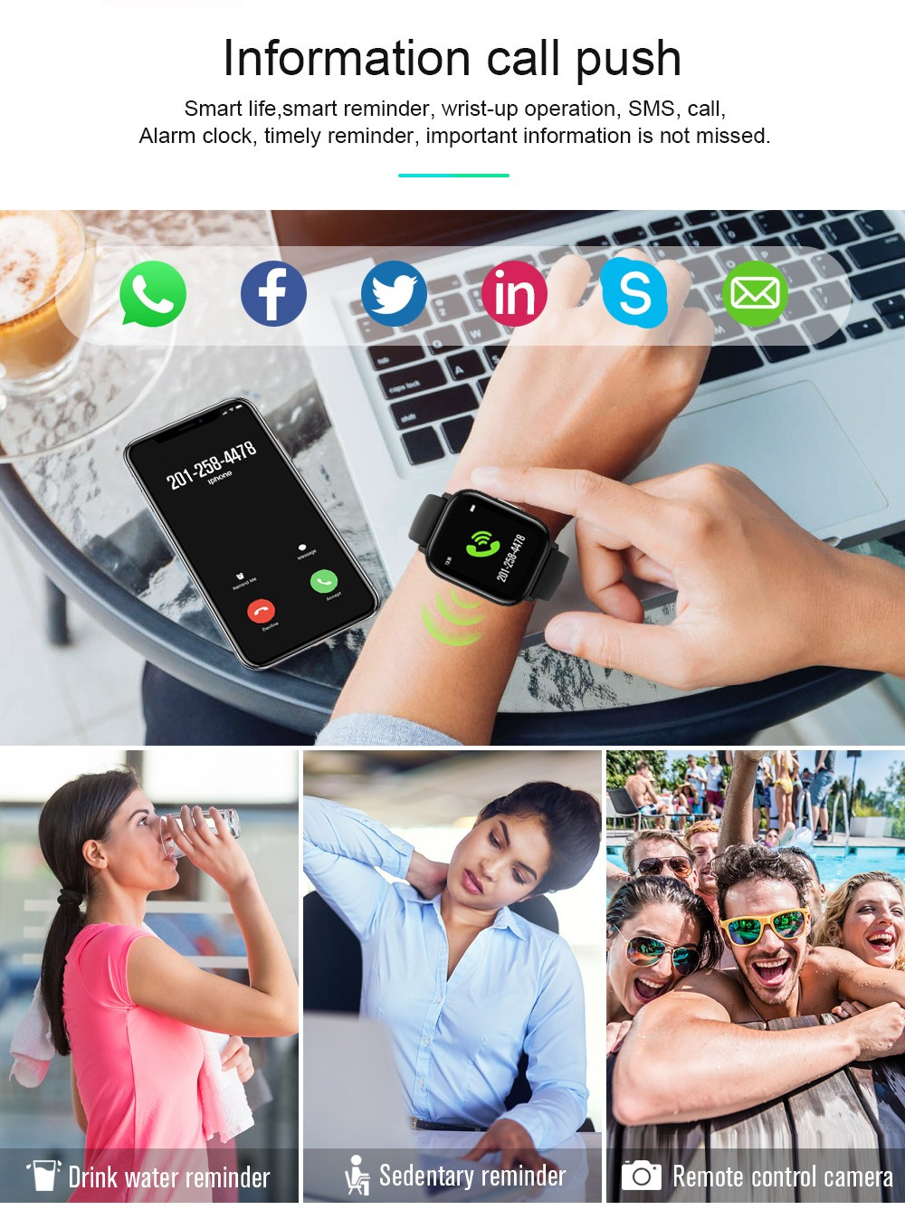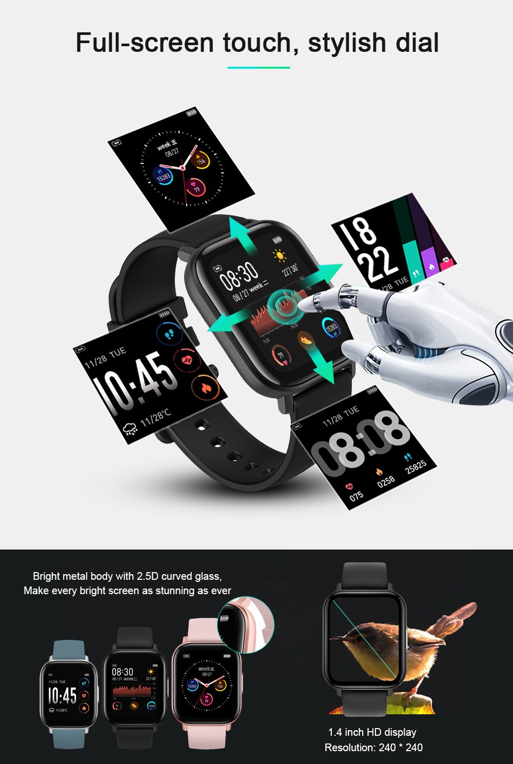 Product modeling:smartbracelet LCD specifications:1.4inch Resolution:240*240 Hardware platform:NRF52832 material:Zinc alloy Memory:64KB+512KB FLASH:64M bit Function Bluetooth:Bluetooth 4.0,supportAndroid and iOS system Multisport mode:support Heart Rate Detection:3300 optical heart rate sensor Body temperature:support Entspannen:support metronome:support Pedometer:support Sleep monitor:support G-SENSOR:support Information push:support Phone calls reminding:support Waterproof:support IP68 Vibration mode:support Side buttons:support Chargers:Magnet Pogo pin GPS:Not support APP name:READsport APP Languge:Chinese, Japanese, Korean, English, French, German, Spanish, Portuguese, Arabic, Russian watch language:China, Britain, Japan, France, Russia, Germany, Portugal, Spain, Arabia Machinery Features:Specifics Size(L*W*H):43.25*36.25*9.5mm Battery:180MA Color:Rose gold, black, silver Package size:102*83*68MM